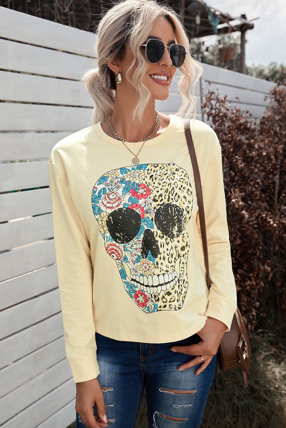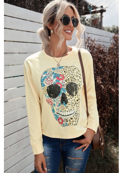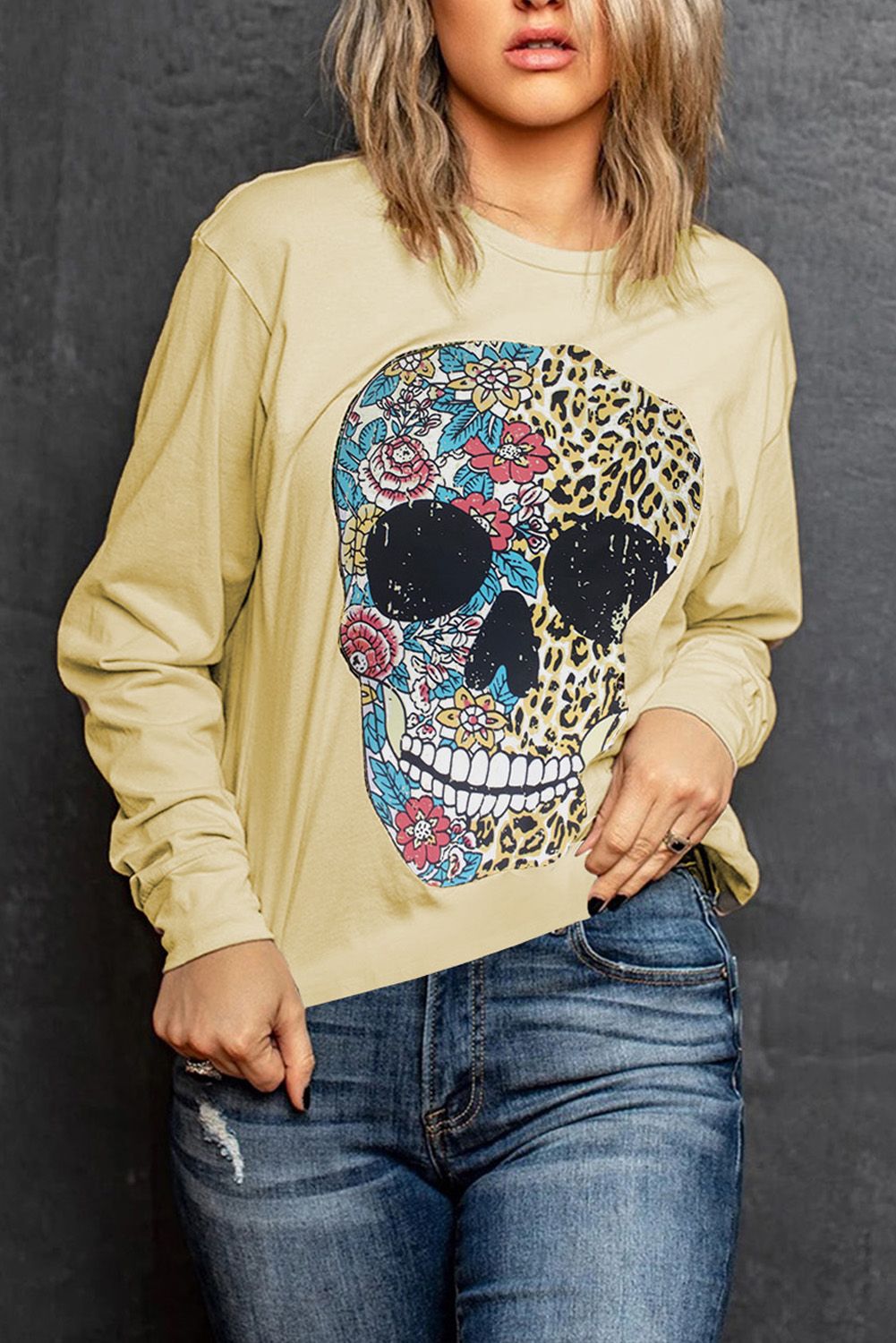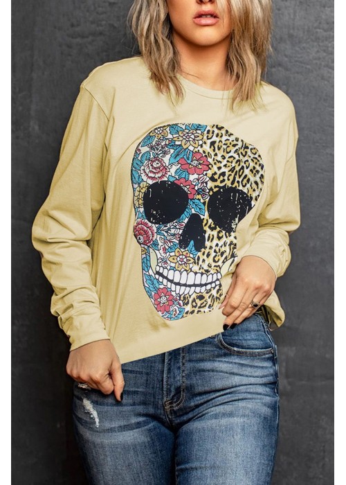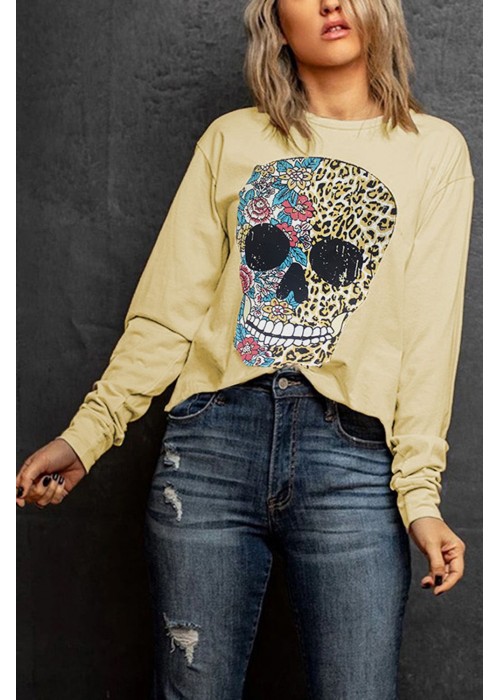 It's a piece of simple long sleeve top but becomes unique and different with the front leopard floral Halloween skull head pattern