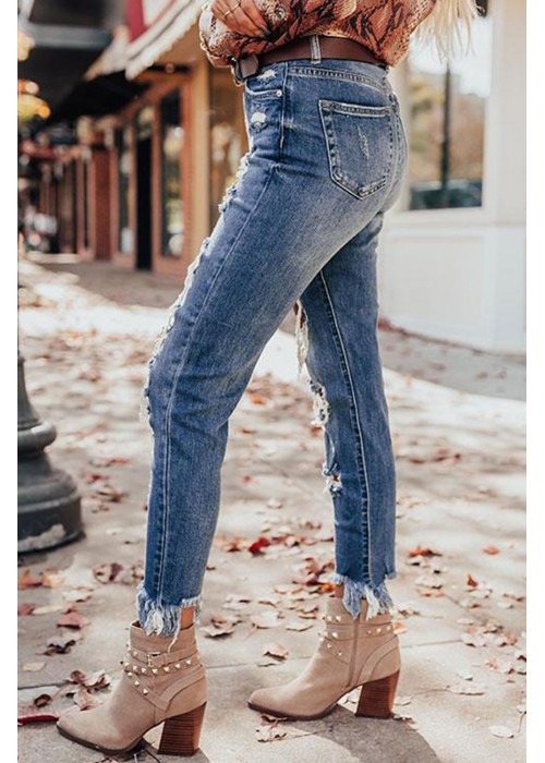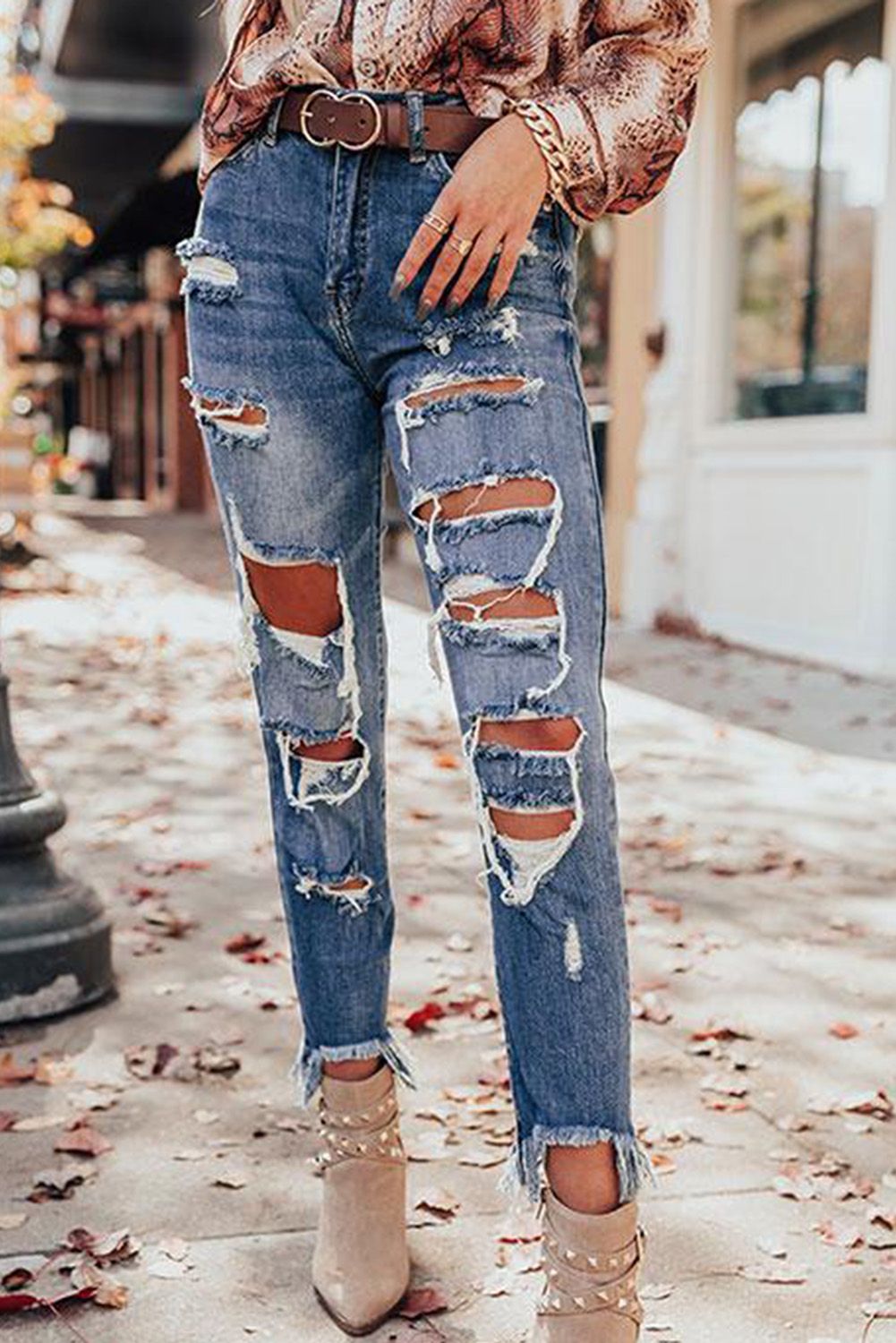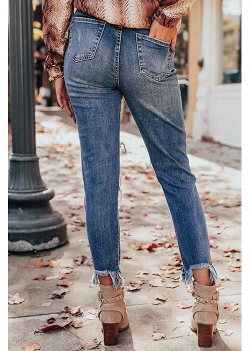High waist, distressed detailing, light wash color, frayed ankle hems, 5 pocket cut, belt loops, and a hidden zip with a button closure