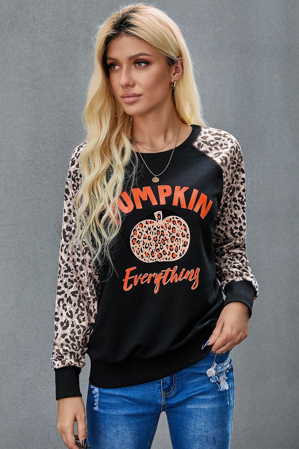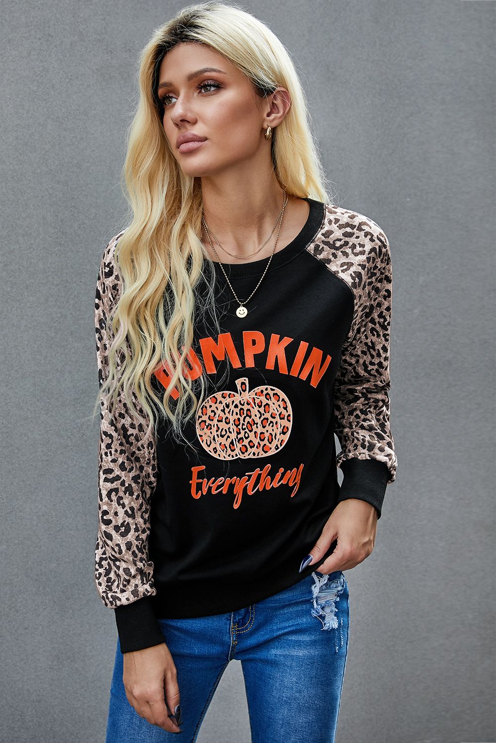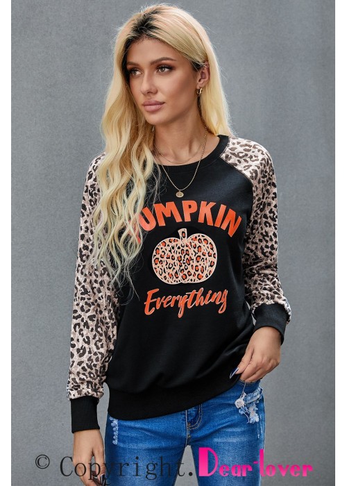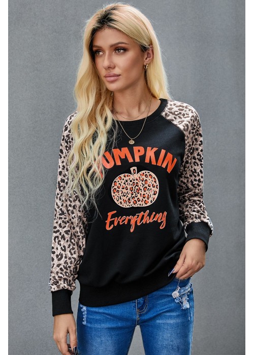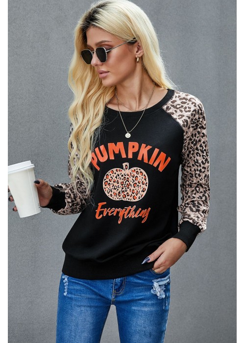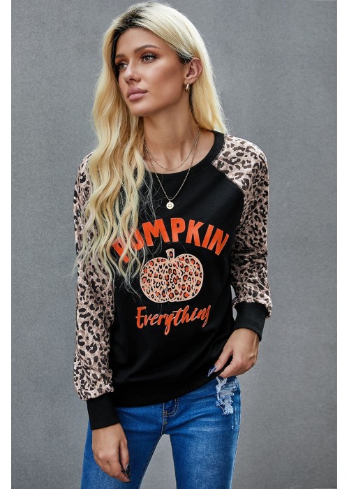 Women's leopard pumpkin print long sleeve crew neck blouse
