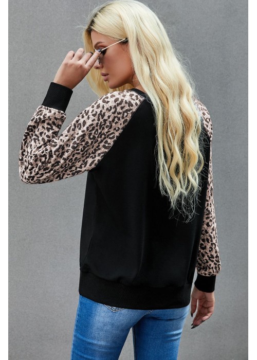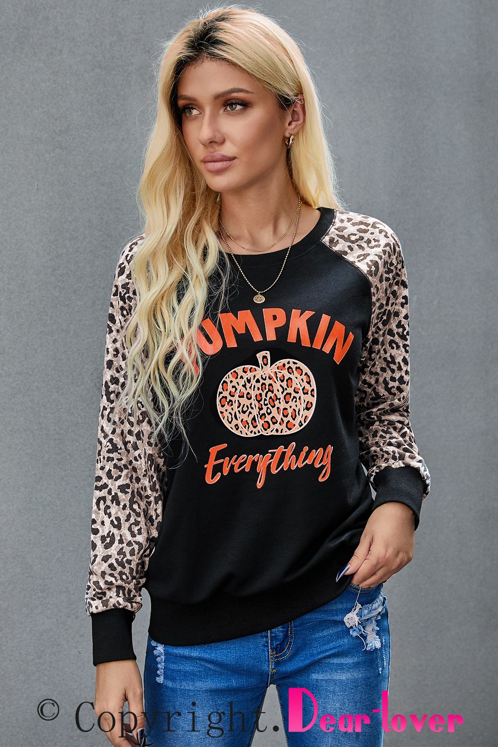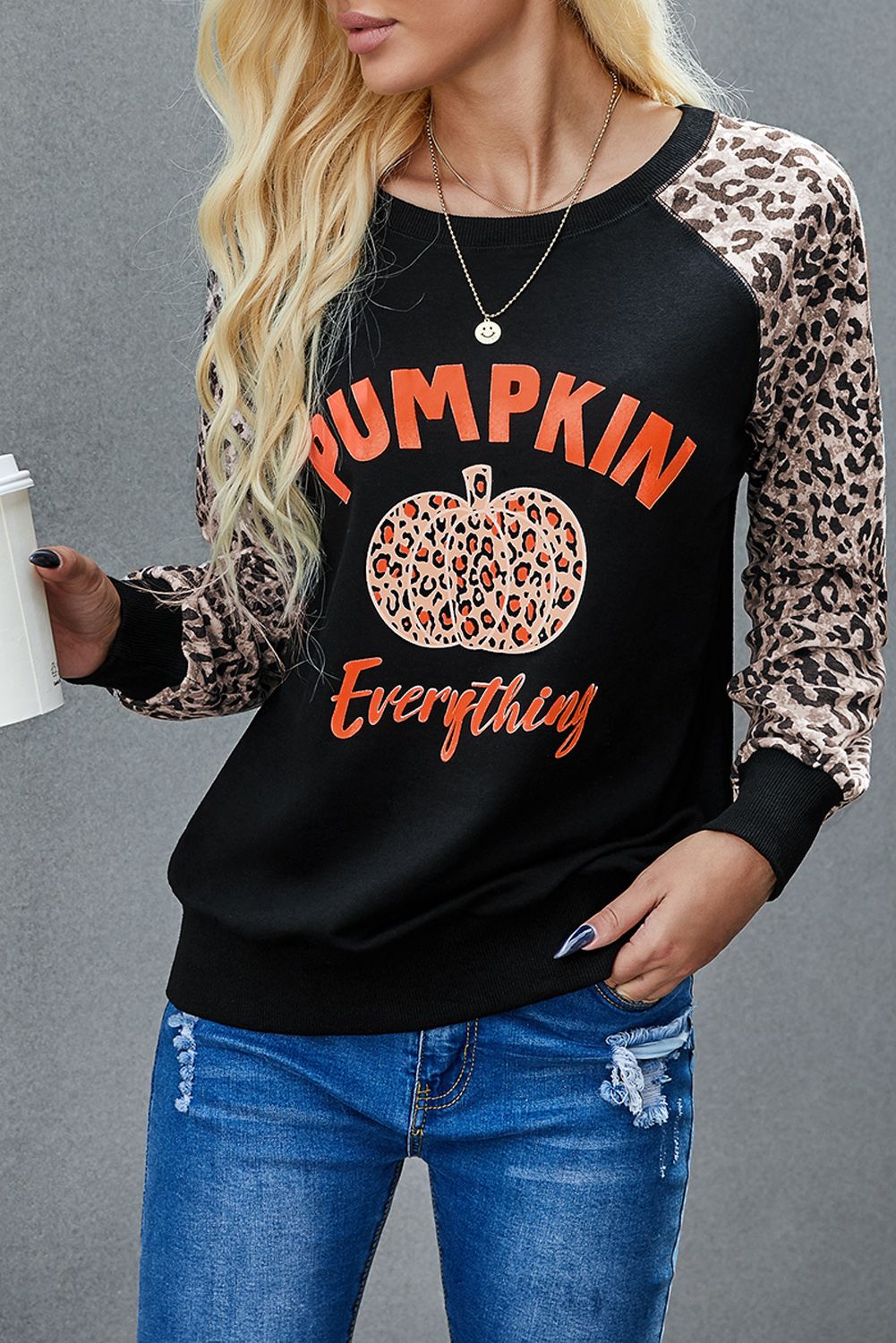 Women's leopard pumpkin print long sleeve crew neck blouse