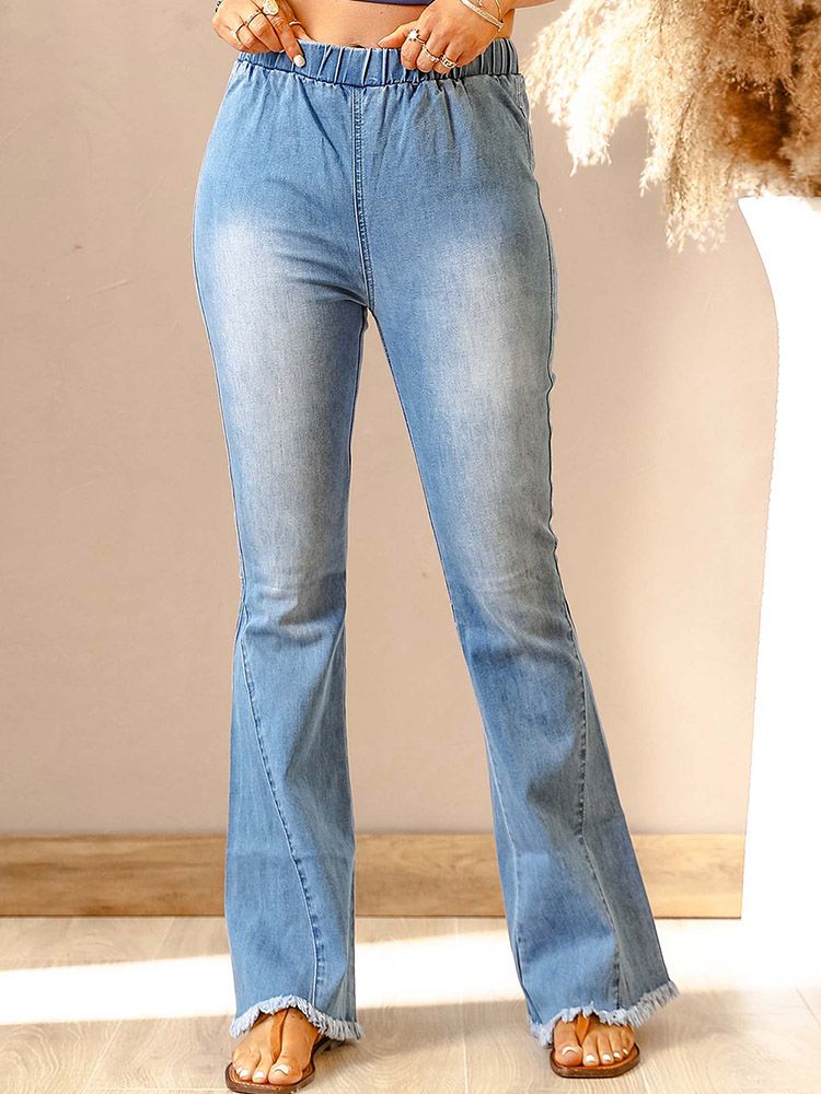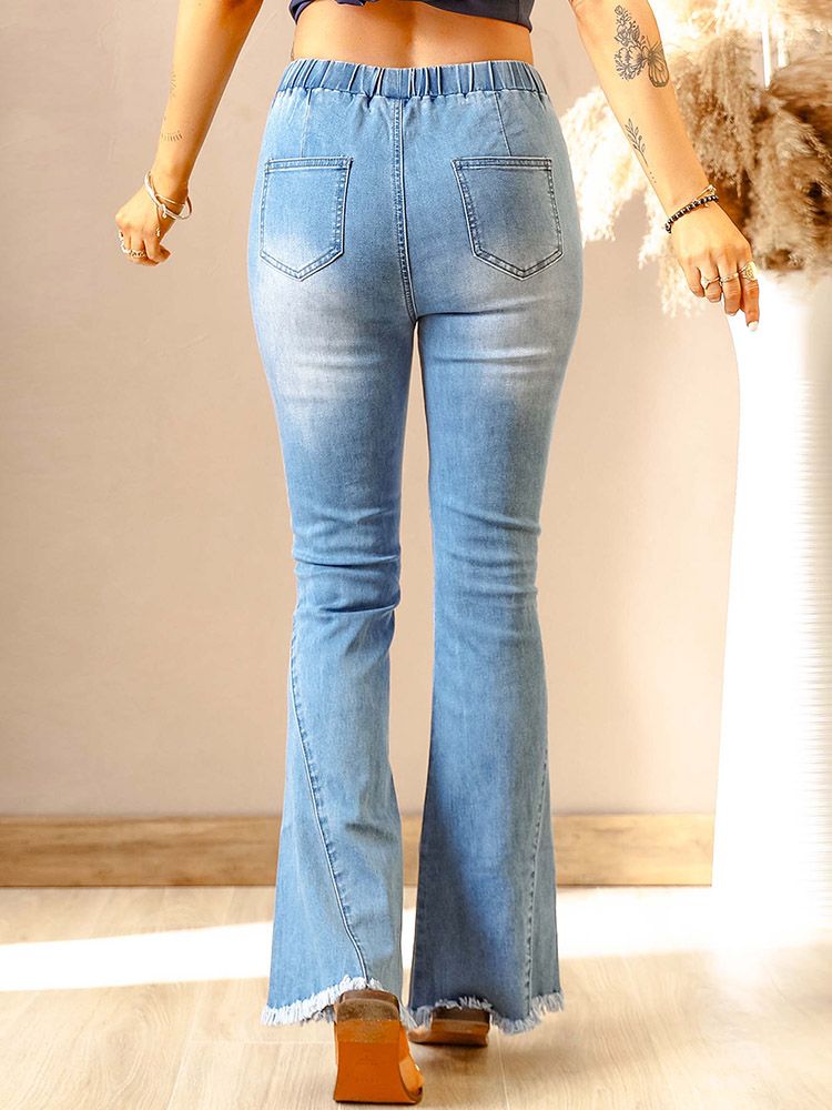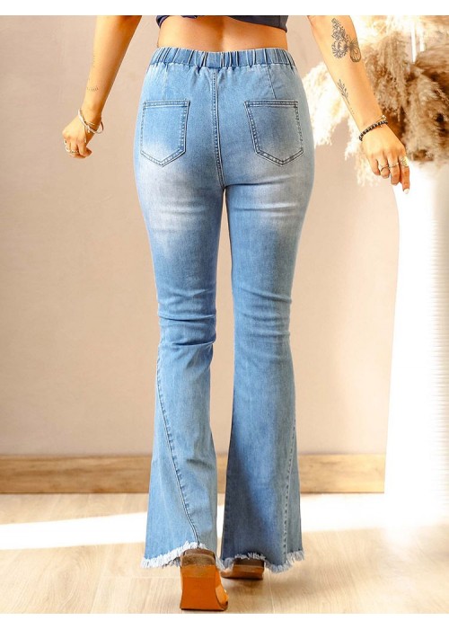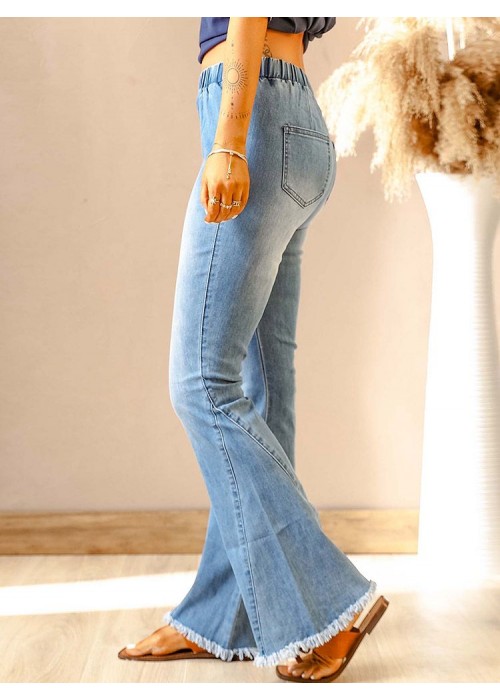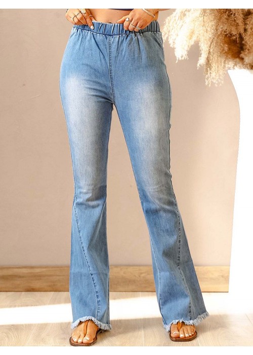 Features include an elastic waist for comfort, with a raw edge hem and back pockets