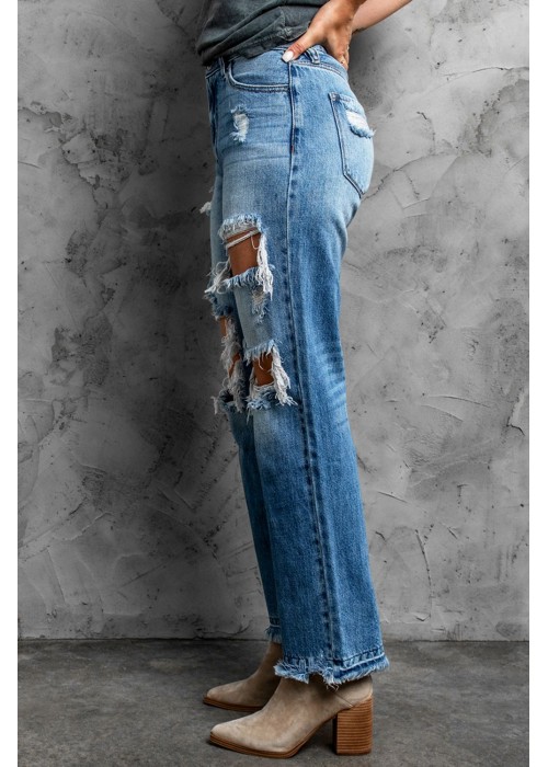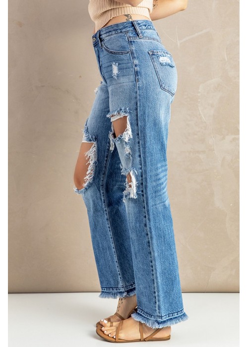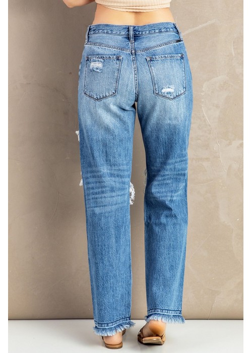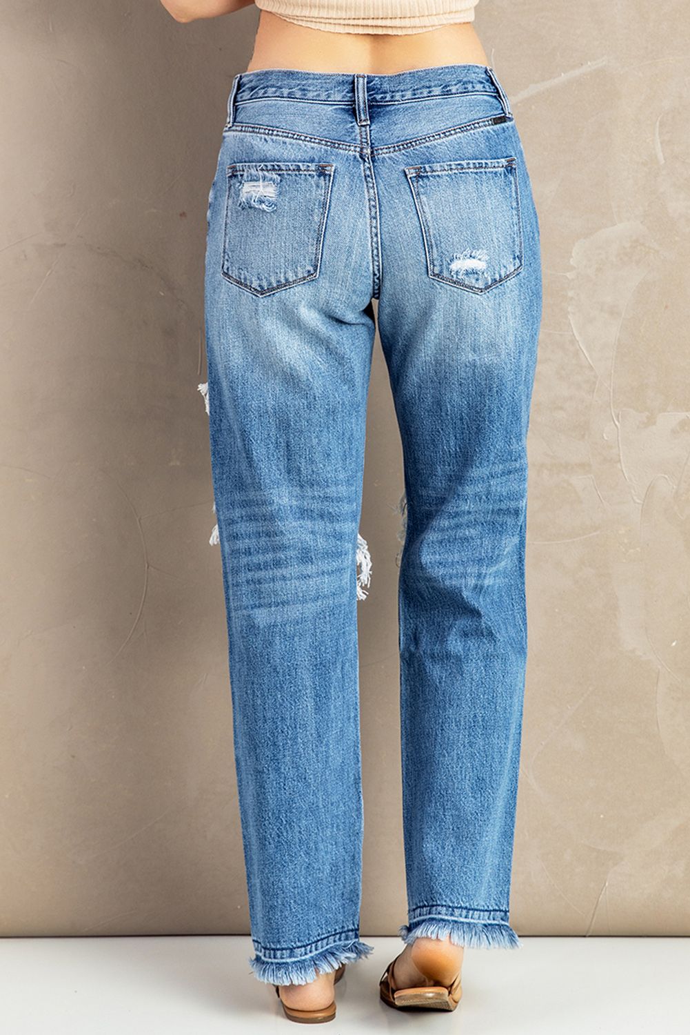 - Zip fly and button closure, pockets front and back, frayed edges finished