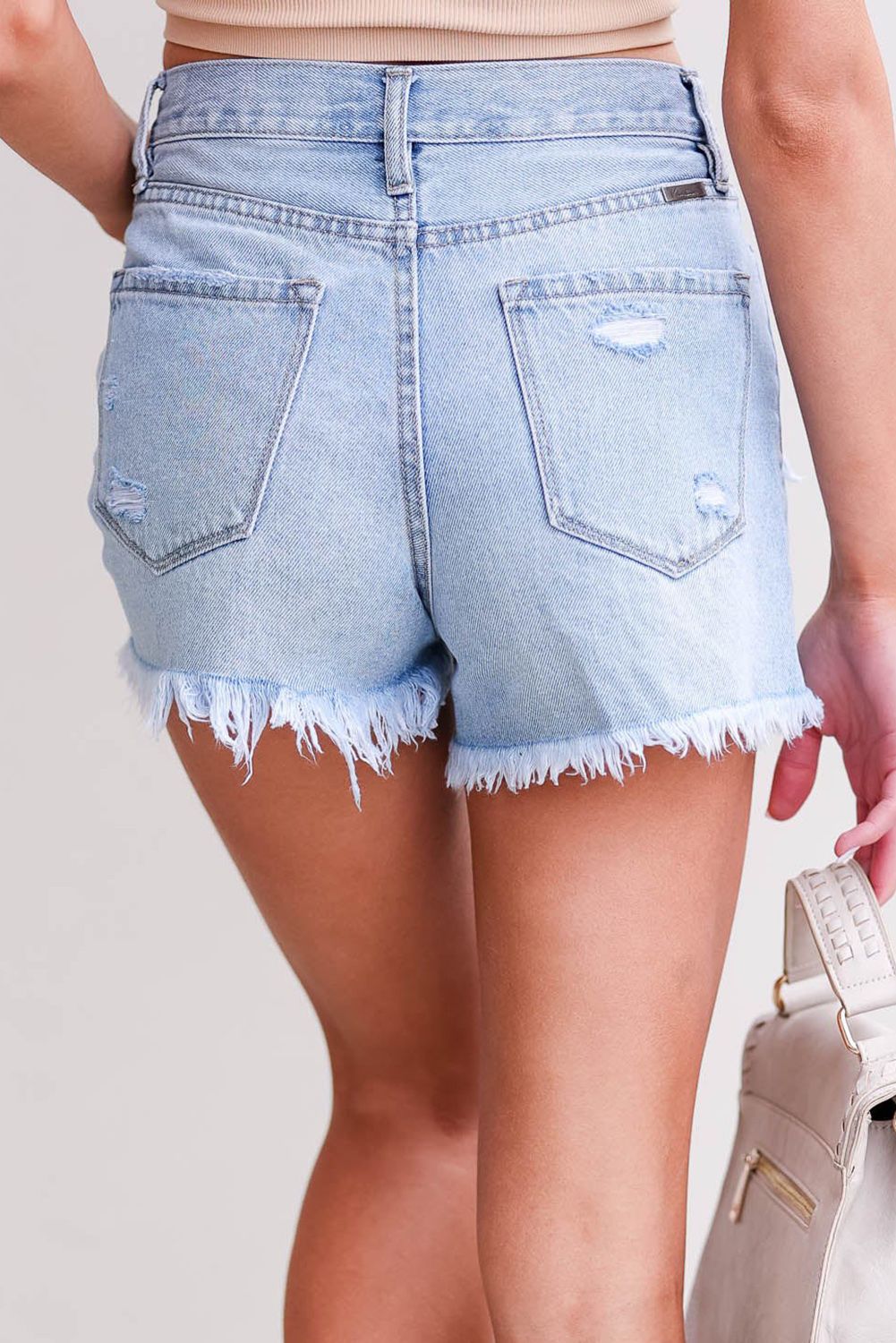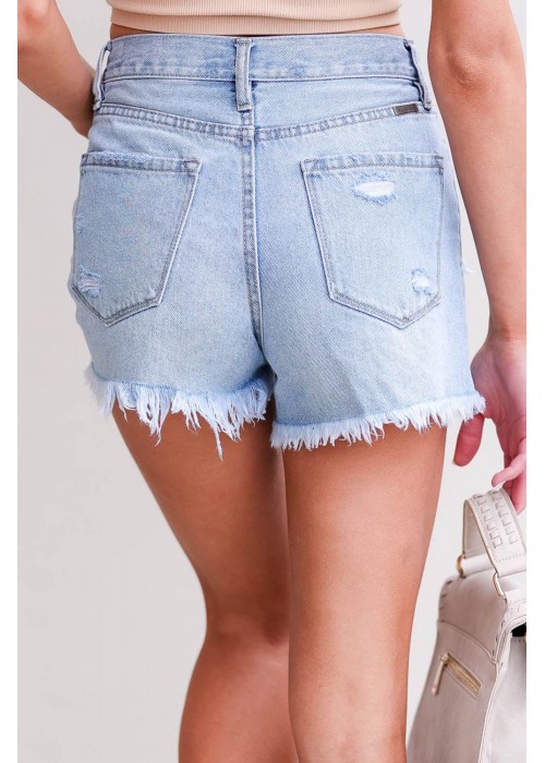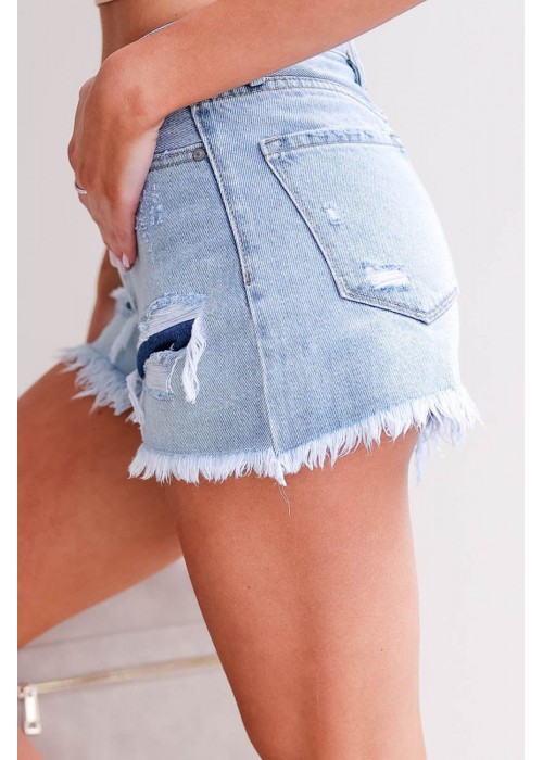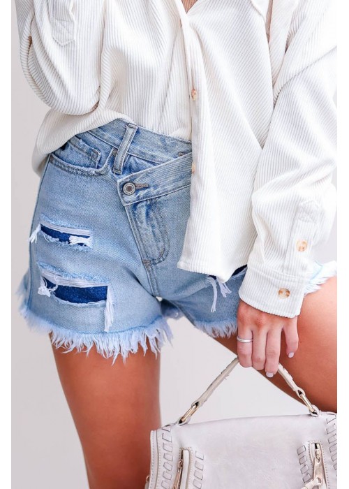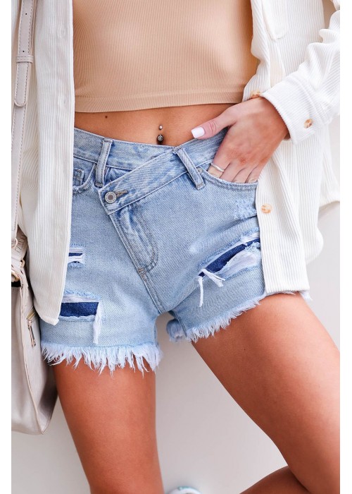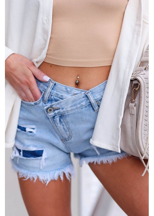 Medium wash, women's high rise distressed crossover shorts featuring a 2 button crossover waist with zip fly closure Distressed denim with a trendy crossover waist makes these shorts a perfect combination of classic and edgy Distressed details on front with patches underneath and classic 5-pocekt design We can pair these denim shorts with any fashionable top without stressWholesale denim shortsare sexy hot to show bombs and the long legs
